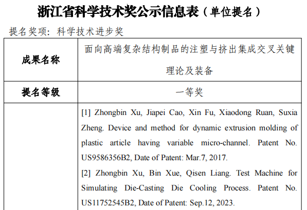 根據《浙江省科學技術廳關于開展2023年度浙江省科學技術獎提名工作的通知》有關要求,現將德清申達機器制造有限公司作為完成人工作單位的成果(成果名稱:面向高端復雜結構制品的注塑與擠出集成交叉關鍵理論及裝備)相關內容予以公示。公示時間:2024年8月9日-2024年8月15日。在公示期內如有異議,可以來電或來信方式反映。凡匿名異議、超出期限異議的,不予受理。聯系人:金萍萍電話:13706535940電子郵箱:Jinpp@injectionmachine.com